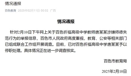 2月11日上午,百色市教育局工作人员告诉奔流新闻记者,此事正在调查中。据百色市教育局通报称,针对关于百色祈福高级中学教师唐某某涉嫌师德失范行为的举报信息,百色市政府高度重视,教育、公安等相关部门已组成联合工作组开展调查。目前已对百色祈福高级中学唐某某予以停职处理,具体情况正在进一步调查核实。
