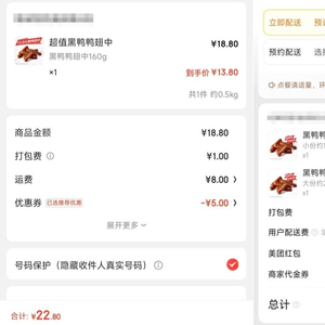 同样的门店和产品,京东秒送起送价为9.9元,而美团起送价格为30元。京东配送费为8元,美团满额免配送费。(左为京东,右为美团)