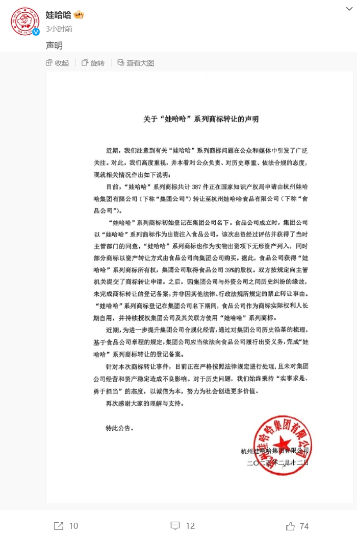 2月12日中午,杭州娃哈哈集团有限公司(简称“娃哈哈集团”)在官方微博发布关于“娃哈哈”系列商标转让的说明。