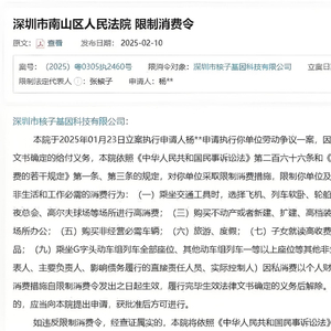 2 月 10 日,深圳市南山区人民法院发出的限制消费令,因未履行劳动争议案,张核子及其公司被禁止高消费,包括乘坐飞机头等舱、入住星级酒店等高消费行为。
