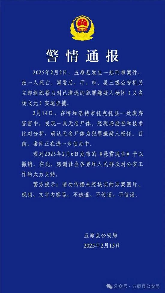 内蒙古五原县公安局2月15日通报,2月2日,五原县发生一起刑事案件,致一人死亡。案发后,厅、市、县三级公安机关立即组织警力对已潜逃的犯罪嫌疑人杨怀(又名杨文元)实施抓捕。2月14日,在呼和浩特市托克托县一处废弃瓷窑中,发现一具无名尸体。经现场勘查和技术比对分析,确认无名尸体为犯罪嫌疑人杨怀。目前,案件正在进一步侦办中。