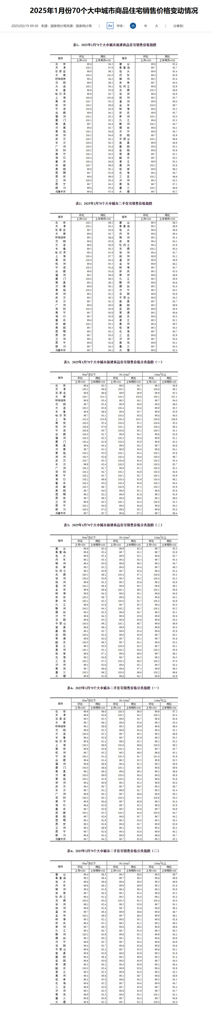 2025年1月份,70个大中城市中,一线城市商品住宅销售价格环比继续上涨,二三线城市环比总体略降;一二三线城市同比降幅均持续收窄。
