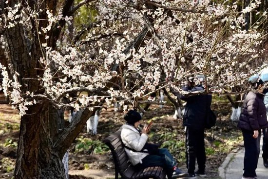 世纪公园内,梅花正逐渐绽放,使得原本光秃秃的枝头一时间变得春意盎然。