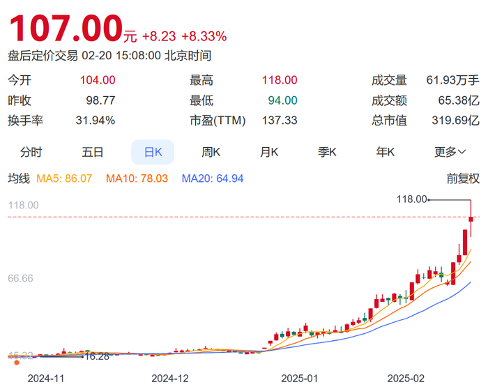 长盛轴承(300718)20日盘中大幅拉升,盘中最高至118元/股,续创历史新高。截至收盘,该股涨超8%,成交约65亿元,换手率近32%。以今日最高点计算,该股较去年2月初10.84元的低点已大涨近10倍。