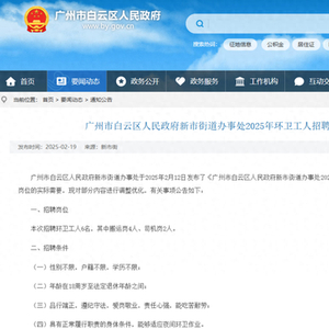 2月20日,广州市白云区人民政府新市街道办事处发布“2025年环卫工人招聘最新公告”(以下简称“最新公告”),称根据拟招聘岗位的实际需要,对部分内容进行调整优化。
