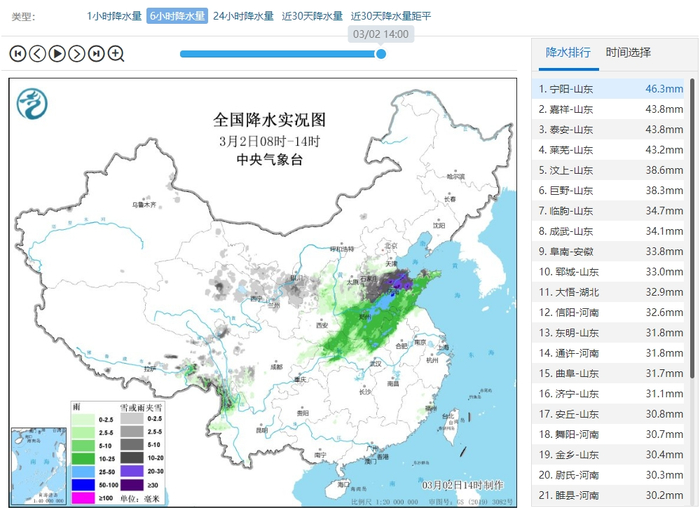 寒潮带来的雨雪也是轰轰烈烈!今天白天(08至14时),山东一带是冷暖交锋最激烈的区域,在全国6小时降水榜上包揽前八。济南13时至14时,单小时降雪量达11.1毫米,为大暴雪级别。