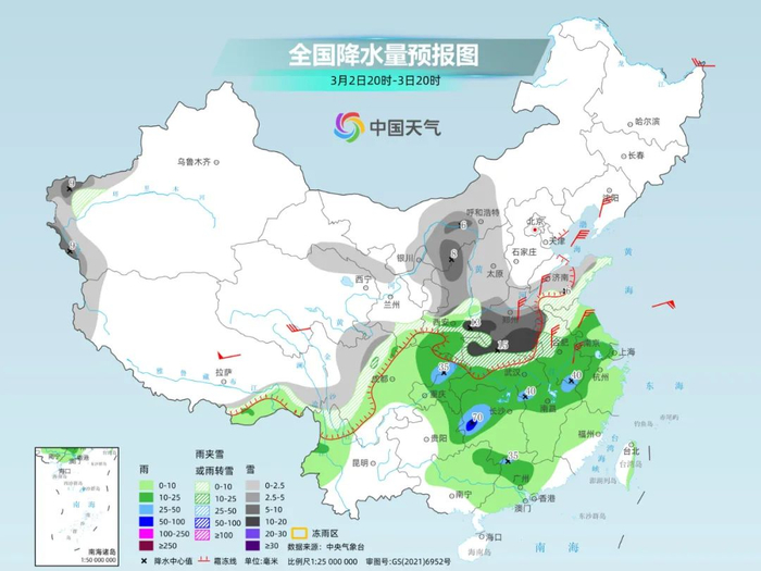 明天,寒潮带来的降水还将持续,范围会扩展至华南地区。南方大部为小到中雨,局部地区或现大雨或暴雨;北方多为小到中雪,其中陕西东南部、河南南部和西部等地部分地区有暴雪。