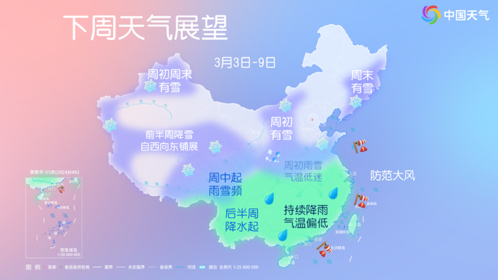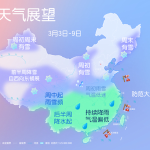 央视网消息:据中国天气网消息,刚刚结束的周末,我国遭遇了3月开场寒潮。这波寒潮不仅凭借一己之力拉垮了全国的气温,还和暖湿气流联手给中东部地区带来了大范围雨雪天气,多地出现强降雪。下周,我国的天气舞台又会怎样呢?