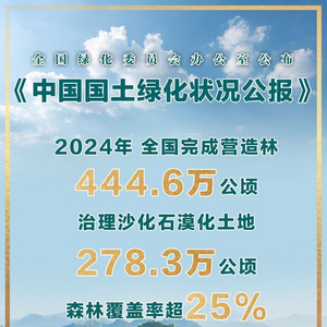 公报显示,2024年,全国完成营造林444.6万公顷,种草改良322.4万公顷,治理沙化石漠化土地278.3万公顷,森林覆盖率超25%,森林蓄积量超200亿立方米。