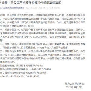 3月12日,中国驻马达加斯加大使馆发布消息称,近期,马达加斯加公安部门破获一起跨国婚姻相关贩卖人口案,多名涉案中国公民被捕。中国驻马达加斯加使馆依法依规维护中国公民合法权益,同时坚决反对一切违法犯罪行为,并支持马强力部门依法打击有关违法犯罪活动。为此,再次提醒中国公民严格遵守相关涉外婚姻法律法规,包括: