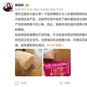3月15日,知名女演员郭晓婷发声,称自己曾经购买的一次性贴身衣物中发现了疑似霉斑或污渍的异物。从郭晓婷晒出的图片可以看到,其购买的产品是一次性内裤。