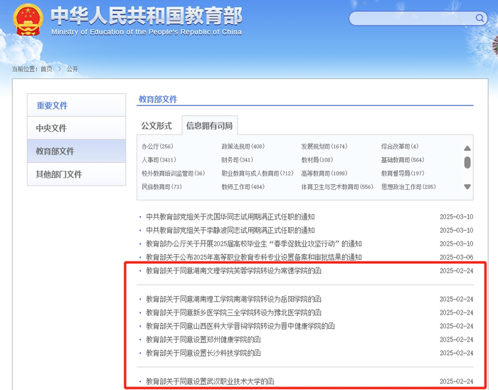 3月17日,教育部官网发布了“教育部关于同意设置武汉职业技术大学的函”“教育部关于同意设置长沙科技学院的函”等7个通知,同意设置武汉职业技术大学、长沙科技学院、郑州健康学院,同意山西医科大学晋祠学院转设为晋中健康学院、同意新乡医学院三全学院转设为豫北医学院的函,同意湖南理工学院南湖学院转设为岳阳学院,同意湖南文理学院芙蓉学院转设为常德学院。