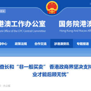 4月1日,中央港澳工作办公室、国务院港澳事务办公室官方网站在“涉港澳资讯”一栏再度转发香港大公报社评《依法审查长和“非一般买卖” 香港政商界坚决支持 “有国家作靠山,企业才能后顾无忧”》,引发舆论关注。