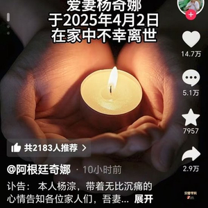 4月6日上午,“网红洋媳妇”杨奇娜的丈夫杨淙在抖音账号“阿根廷奇娜”发布讣告:“本人杨淙,带着无比沉痛的心情告知各位家人们,吾妻杨奇娜于2025年4月2日上午,因突发低血糖与世长辞,终年38岁。”6日晚,新黄河记者联系上杨淙,确认消息属实。杨淙对新黄河记者称:“我真的好难受。奇娜和我在一起20年了,她真的是个很好的人,又孝顺又知书达理,又非常谦卑爱学习。”
