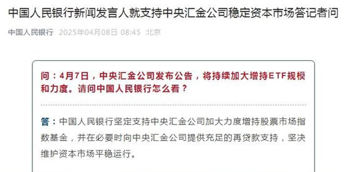 近日,美国政府滥施关税引发全球市场剧烈波动。4月7日,市场迎来“黑色星期一”,A股出现较大跌幅。当日尾盘时分,中央汇金发布公告称,坚定看好中国资本市场发展前景,充分认可当前A股配置价值,并表示已再次增持ETF,未来将继续增持。