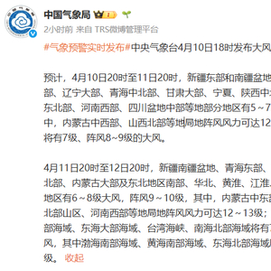 据@中国气象局 发布,中央气象台4月10日18时发布大风橙色预警,部分地区阵风风力可达12~13级。