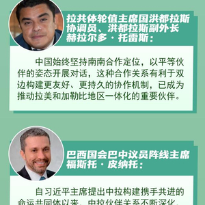 命运与共,大道同行。2014年,习近平主席首次提出构建中拉命运共同体,为新时代中拉关系发展指明了方向,得到拉美和加勒比国家积极响应。近年来,从就“引领中拉友好关系驶入新航程”提出建议,到提出新时代中拉关系内涵,习近平主席始终着眼于中国与拉美和加勒比国家命运与共的未来,推动中拉关系稳步前进。拉美地区媒体及政学界人士表示,中国始终坚持南南合作定位,以中拉命运共同体理念为指引,持续推动双边关系升级,已成为推动拉美和加勒比地区一体化的重要伙伴。