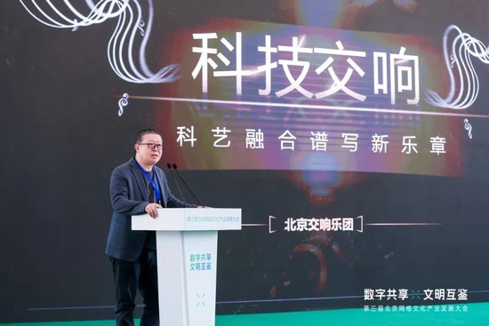 随后,由北京交响乐团团长李长军以《科艺融合谱写“科技交响”新乐章》为题,开启了本届大会的主题分享环节,李长军在分享中以《原神》《王者荣耀》等的音乐会成果为例,谈到无论是世界还是中国,交响乐都遇到了需要“创新”的问题。需要和不同艺术形式进行融合,否则交响乐很可能会失去市场,也无法赢得年轻的观众。他希望在交响乐领域有更多的优秀作品经过科技的助力融合,不断呈现给大众新的“音乐盛宴”。