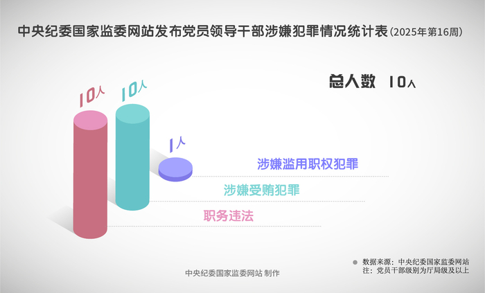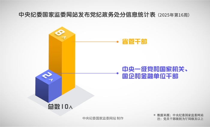 2025年第16周,中央纪委国家监委网站共发布10名党员领导干部被党纪政务处分信息。其中,中央一级党和国家机关、国企和金融单位干部2人,省管干部8人。