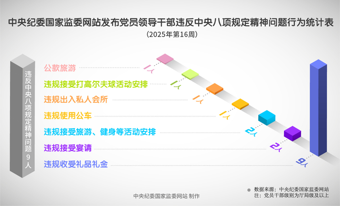 2025年第16周,中央纪委国家监委网站通报的10名被处分党员领导干部中,有9人存在违反中央八项规定精神问题。违反中央八项规定精神具体行为包括:违规收受礼品礼金,违规接受宴请,违规接受旅游、健身等活动安排,违规使用公车,违规出入私人会所,违规接受打高尔夫球活动安排,公款旅游等。其中,“违规收受礼品礼金”情况占比最高。(中央纪委国家监委网站 郭兴 制图 王婵)