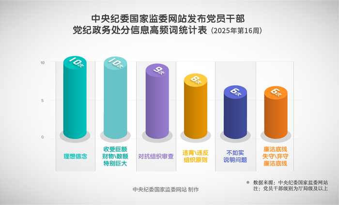 2025年第16周,在中央纪委国家监委网站发布的党纪政务处分通报中,“理想信念”“收受巨额财物\数额特别巨大”在每则党纪政务处分通报中均有出现。此外,“对抗组织审查”“违背\违反组织原则”“不如实说明问题”“廉洁底线失守\弃守廉洁底线”也是高频词。