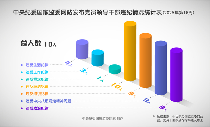 2025年第16周,中央纪委国家监委网站发布的党纪政务处分信息中,10名被处分党员领导干部均存在违反廉洁纪律问题,有9人存在违反政治纪律、组织纪律、中央八项规定精神问题。1人违反群众纪律,3人违反工作纪律,4人违反生活纪律。