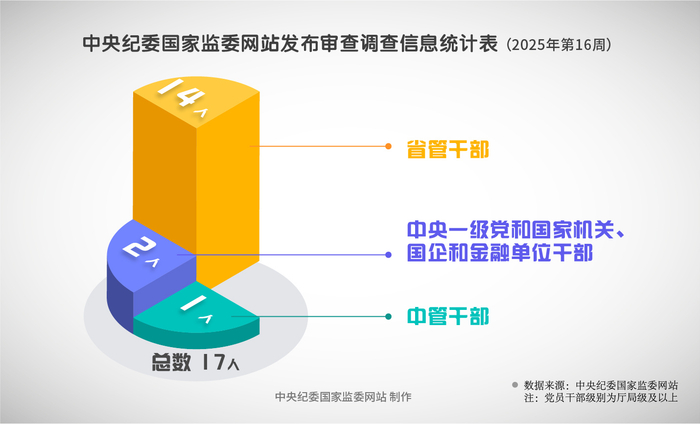 2025年第16周,中央纪委国家监委网站共发布17名党员领导干部接受审查调查信息。其中,中管干部1人,中央一级党和国家机关、国企和金融单位干部2人,省管干部14人。