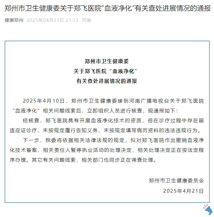 央视网消息:郑州市卫生健康委员会4月21日通报,4月10日,郑州市卫生健康委接到河南广播电视台关于郑飞医院“血液净化”相关问题线索后,立即组织人员进行核查,现通报如下:
