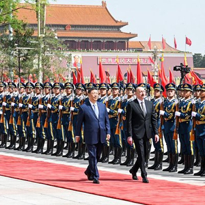 阿利耶夫抵达时,礼兵列队致敬。习近平同阿利耶夫登上检阅台,军乐团奏中阿两国国歌,天安门广场鸣放21响礼炮。阿利耶夫在习近平陪同下检阅中国人民解放军仪仗队,并观看分列式。
