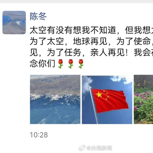[#陈冬上太空前发了朋友圈#]#陈冬发朋友圈说想太空了# 今天,神舟二十号出征,航天员陈冬、陈中瑞、王杰将奔赴太空。上午,陈冬发了朋友圈:“太空有没有想我不知道,但我想太空了。”转发!#一人一句为神二十航天员加油#,祝福中国航天!