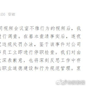 关注到网上流传一则涉及我公司视频会议室不雅行为的视频后,我公司于24日17时成立专项工作组进行调查。在基本查清事实后,连夜召开专门会议,依据公司员工违纪违规处罚办法,鉴于该事件对公司造成非常恶劣的影响,决定对涉事员工立即进行停职检查。我们对由此给社会公众带来的不良影响再次深表歉意,也将深刻反思工作中存在的不足,有针对性地加强员工的职业道德建设和行为规范管理。衷心感谢社会各界的关心和支持。#铁塔指挥中心屏幕现男女暧昧视频#