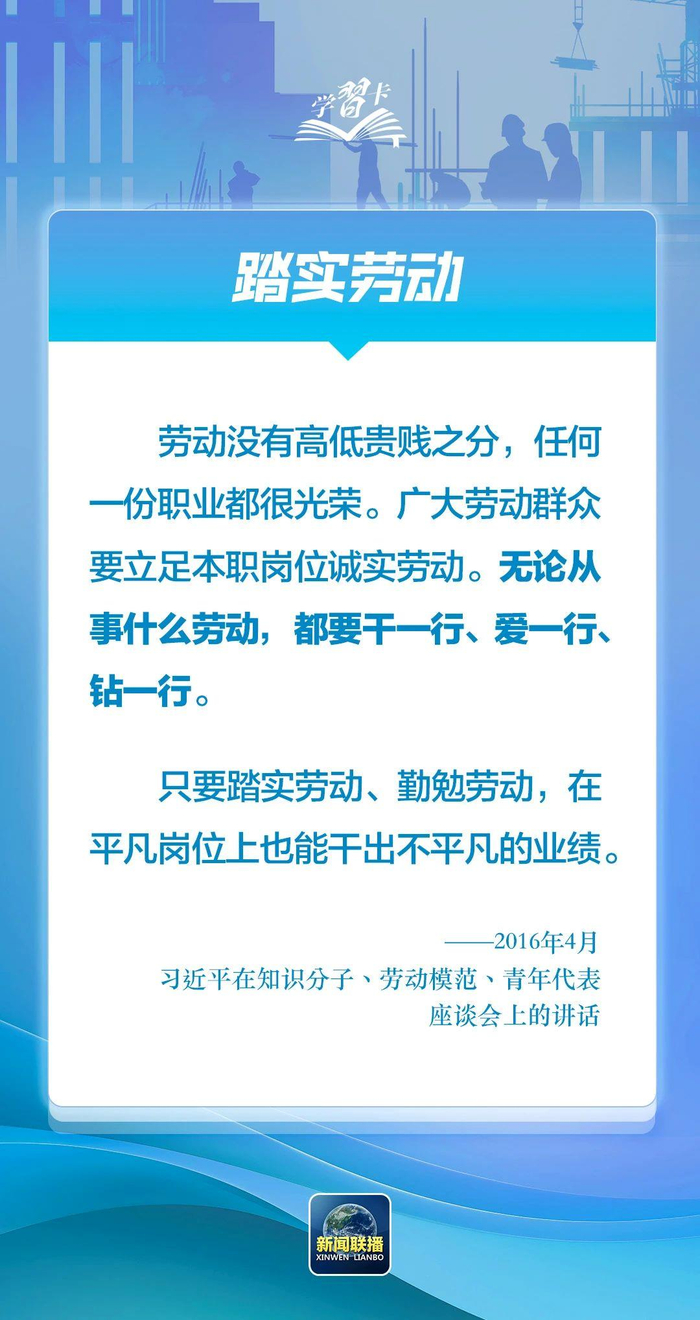 多年来,习近平总书记一直情系广大劳动者。无论时代条件如何变化,我们都要大力弘扬劳动最光荣、劳动最崇高、劳动最伟大、劳动最美丽的社会风尚,营造尊重劳动、尊重知识、尊重人才、尊重创造的良好氛围。