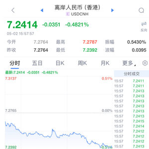 5月2日,离岸人民币汇率涨超350点,升破7.25关口,现报7.2414。