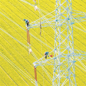 5月4日,电力施工人员在江苏省扬州市江都区武坚镇至江苏省兴化经济开发区的集中式光伏项目配套输电线路上作业。 新华社发(任飞 摄)