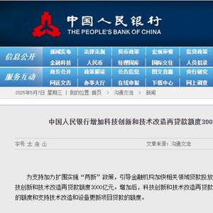 中国人民银行增加科技创新和技术改造再贷款额度3000亿元 支持加力扩围实施“两新”政策