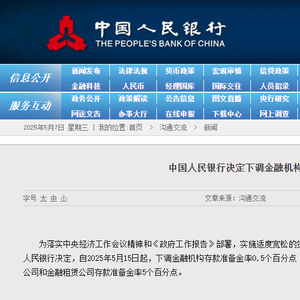央视网消息:为落实中央经济工作会议精神和《政府工作报告》部署,实施适度宽松的货币政策,提高宏观调控的前瞻性、针对性、有效性,中国人民银行决定,自2025年5月15日起,下调金融机构存款准备金率0.5个百分点(不含已执行5%存款准备金率的金融机构),下调汽车金融公司和金融租赁公司存款准备金率5个百分点。