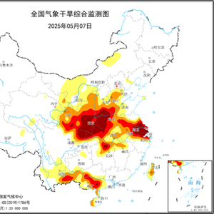 中央气象台5月7日18时继续发布气象干旱黄色预警:据实时气象干旱监测,陕西、河南、江苏、广西等省区存在重旱,其中,陕西南部、河南西部、湖北西北部、江苏南部等地特旱。预计,未来3天,西南地区东部、江南、华南大部地区先后有大到暴雨,江淮、江汉大部有中到大雨,江苏南部等地有暴雨或大暴雨,对缓和气象干旱有利,其余旱区少雨,气象干旱将维持或发展。