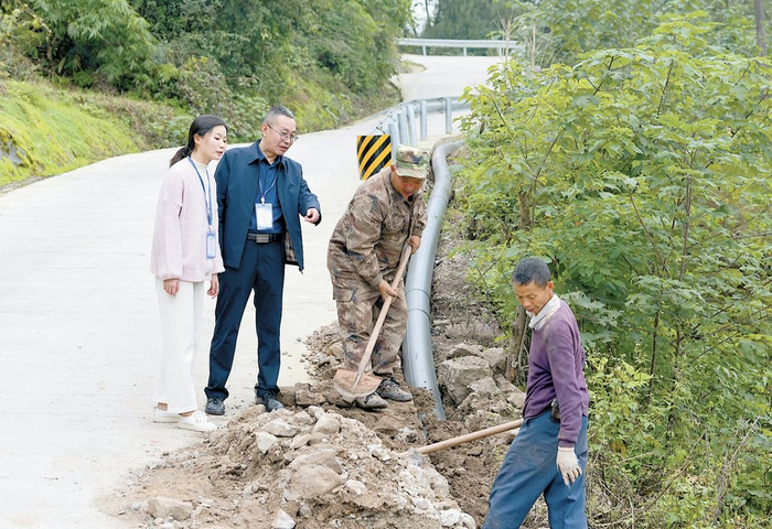 重庆市忠县纪委监委联合有关部门对农村安全饮水项目建设进度及质量进行监督检查,确保群众喝上安全放心的自来水。图为该县纪检监察干部在磨子土家族乡磨子社区了解自来水管道铺设等有关情况。