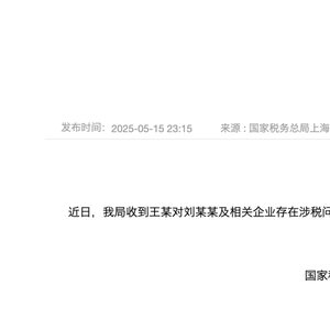5月15日晚,国家税务总局上海市税务局第四稽查局发布情况通报称“近日,我局收到王某对刘某某及相关企业存在涉税问题的举报,目前正在依法依规办理。”