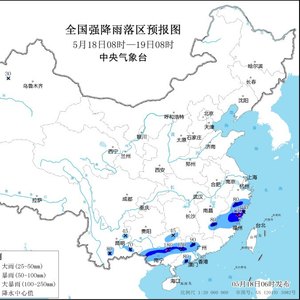 央视网消息:中央气象台5月18日06时继续发布暴雨蓝色预警:预计,5月18日08时至19日08时,浙江南部、江西东南部、福建中北部、云南东南部、广西中部和东北部、广东中西部等地部分地区有大到暴雨,其中,浙江东南部、福建东北部、广西中东部、广东西部等地部分地区有大暴雨(100~180毫米)。上述部分地区伴有短时强降水(最大小时降雨量30~60毫米,局地可超过80毫米)等强对流天气。