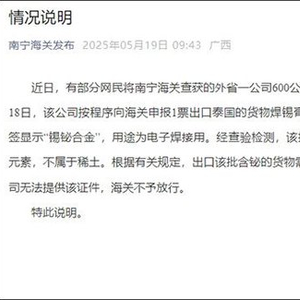 广西南宁海关微信公众号“南宁海关发布”5月19日发布情况说明称,近日,有部分网民将南宁海关查获的外省一公司600公斤焊锡膏误传为稀土材料。