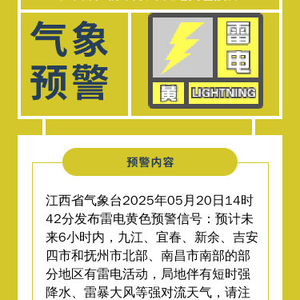 央视网消息:据江西省气象局微博消息,江西省气象台5月20日14时42分发布雷电黄色预警信号:预计未来6小时内,九江、宜春、新余、吉安四市和抚州市北部、南昌市南部的部分地区有雷电活动,局地伴有短时强降水、雷暴大风等强对流天气,请注意防范。
