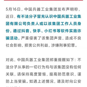 此前,中国兵器工业集团曾发布声明称,有人冒充中国兵器工业集团人员诈骗。