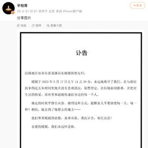 [演员辛柏青发讣告,妻子朱媛媛去世]辛柏青微博5月21日发讣告,全文如下: