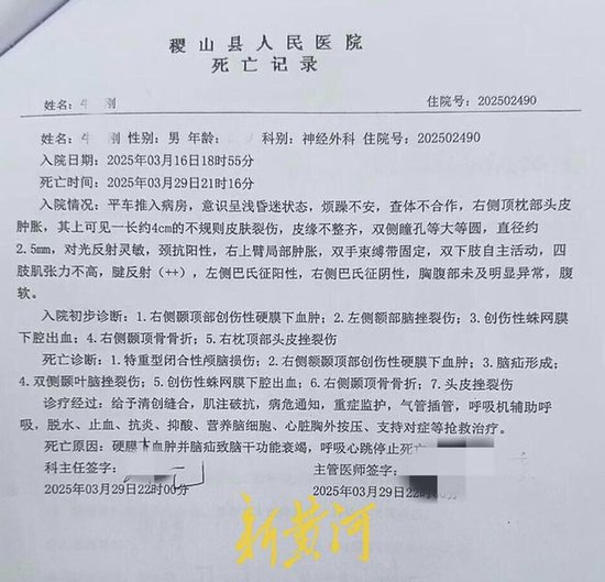 “事发现场人就昏迷了,当天下午送到医院,当晚就下了病危通知书。”牛先生称,事发后,其弟被医院诊断为“特重型闭合性颅脑损伤、右侧额颞顶部创伤性硬膜下血肿、脑疝形成、左侧额部脑挫裂伤、创伤性蛛网膜下腔出血、右侧颞顶骨骨折、头皮挫裂伤”等。3月29日,牛某刚医治无效后死亡,医院出具的死亡记录显示其死亡原因为“硬膜下血肿并脑疝致脑干功能衰竭,呼吸心跳停止死亡。”3月30日,家属认为处警人员在处警过程中存在违规操作,涉嫌故意伤害、过失致人死亡,就此事向当地警方报案。4月7日,稷山县公安局受理该案。