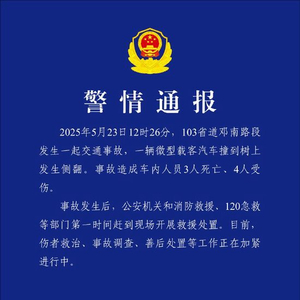 武汉经济技术开发区公安分局通报,5月23日12时26分,103省道邓南路段发生一起交通事故,一辆微型载客汽车撞到树上发生侧翻。事故造成车内人员3人死亡、4人受伤。