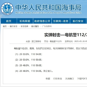央视网消息:据中国海事局网站消息,湛江海事局发布航行警告,5月27日至30日,每天8时至17时,南海部分海域进行实弹射击,禁止驶入。