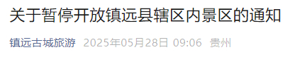 受强降雨天气影响,贵州镇远县境内以下景区暂停运营:高过河景区、㵲阳河景区、古城水上游、文化园水上娱乐项目、青龙洞景区、石屏山景区、铁溪景区,具体恢复运营时间另行通知。