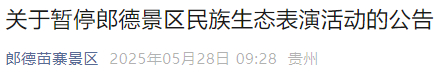 因持续降雨天气影响,为确保安全,贵州黔东南郎德景区将临时取消2025年5月28日上午11:00-12:10十二道迎宾酒及民族生态表演活动。