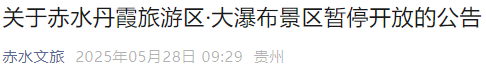 关于赤水丹霞旅游区·大瀑布景区暂停开放的公告